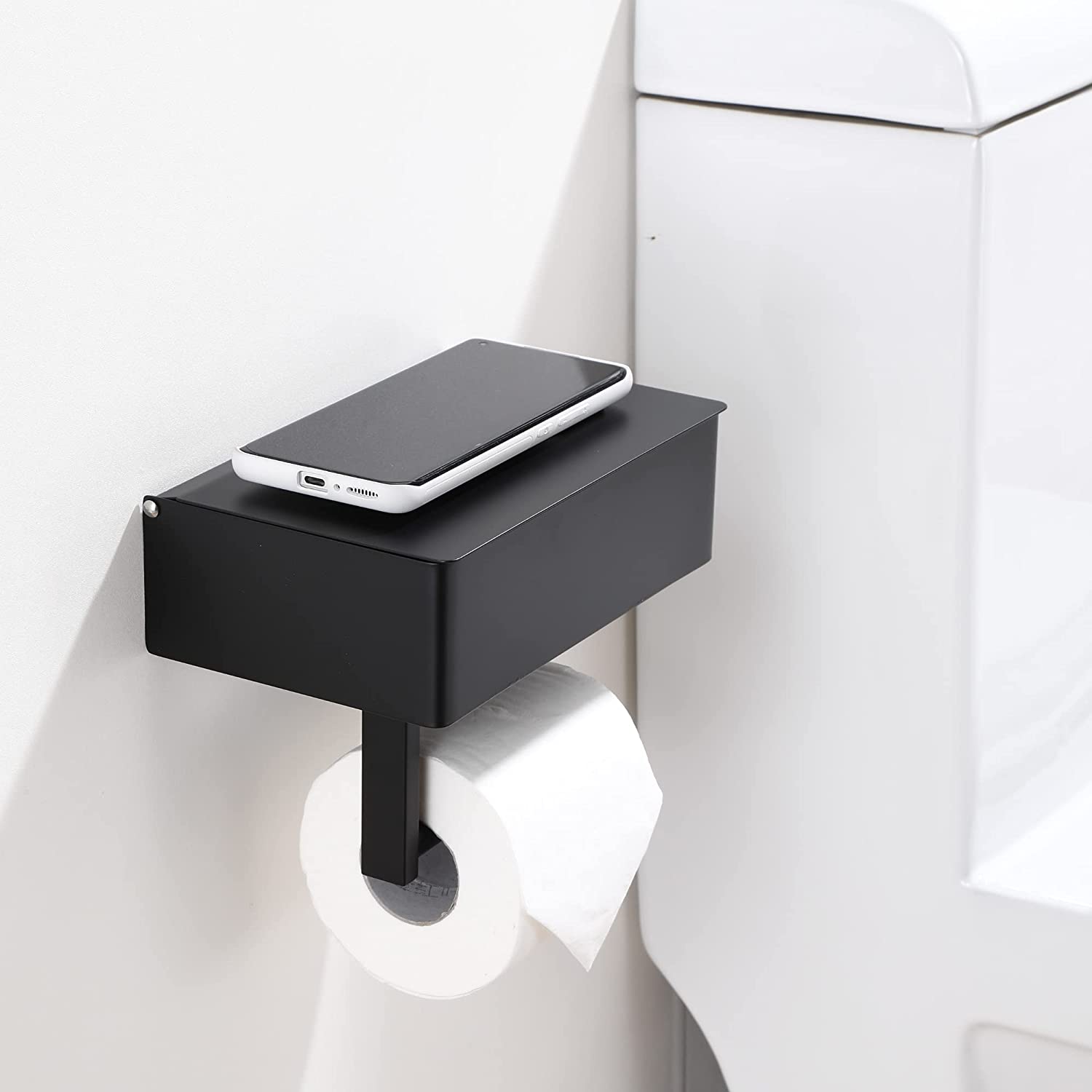 Zwarte Zelfklevende WC-rolhouder zonder Boren - Inclusief Opbergruimte voor Babydoekjes & Handig Plankje voor Tissues
