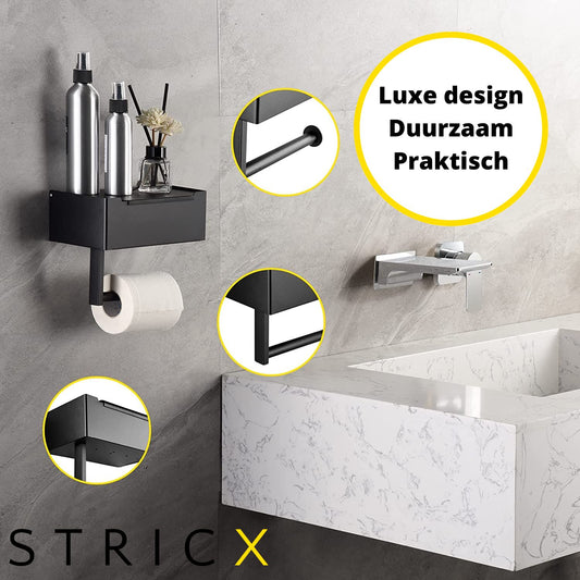 Zwarte Zelfklevende WC-rolhouder zonder Boren - Inclusief Opbergruimte voor Babydoekjes & Handig Plankje voor Tissues
